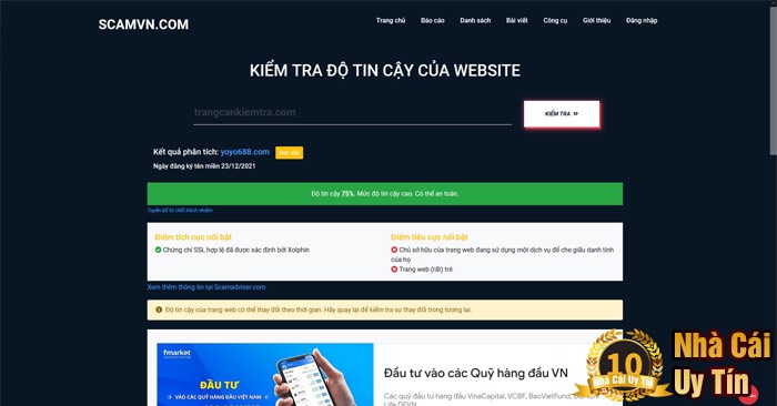 SCAMVN.COM là web đánh giá mức độ tin cậy của các nhà cái online. Anh em vào web, nhập tên nhà cái muốn kiểm tra để xem kết quả. Nếu từ 90% trở lên, nhà cái đó ở mức uy tín cao. Kiểm tra YOYO688 trên SCAMVN.COM chỉ đạt 75%, có điểm tiêu cực là tuổi đời web rất mới và chủ sở hữu che dấu danh tính.