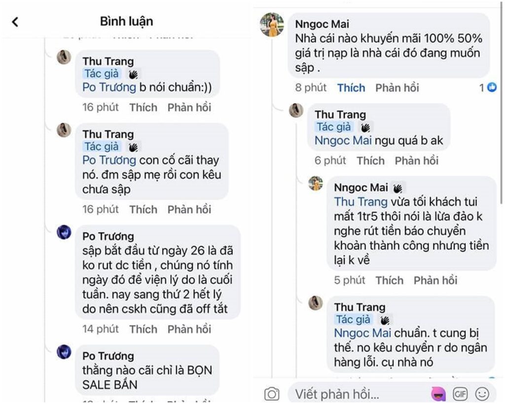 Trên fanpage Hội Bóc Phốt Nhà Cái, thông tin YOYO688 lừa người chơi bắt nguồn từ câu hỏi “Có ai bị yoyo688 lừa chưa” đăng ngày 28/3. Sau đó là hàng loạt các bình luận đồng cảm, bài viết bóc phốt YOYO688 không rút được tiền. Các bài viết đều có dẫn chứng tin nhắn trao đổi với đại lý, ảnh chụp giao dịch.