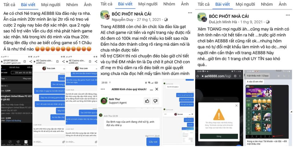 Phốt về nhà cái AE888 trên các hội nhóm cực nhiều, đủ kiểu vạch trần AE888 gian dối và lừa đảo. Nhà Cái Đá Gà Gemwin.vn sẽ giúp anh em hiểu rõ những thủ đoạn mà AE888 ăn chặn tiền của người chơi.