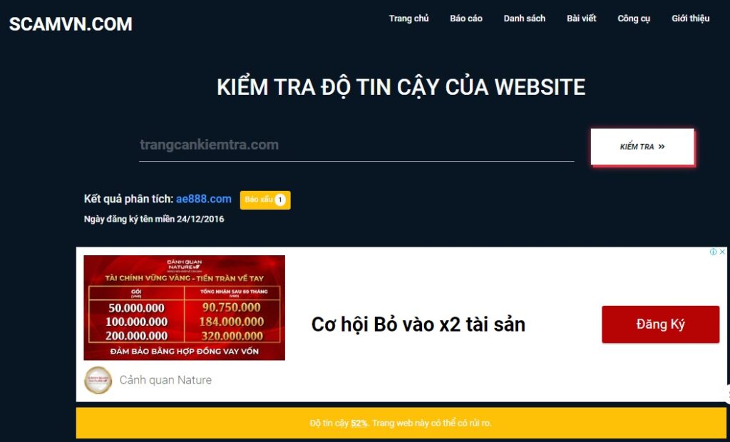 Xuất phát là nhà cái đang tin cậy nhưng thực tế AE888 lại hoạt động gian dối. Trên công cụ SCAMVN.COM, kết quả kiểm tra web AE888.com chỉ đạt mức uy tín 52%. Phía dưới có thông báo về điểm tiêu cực của AE888 là “tên miền này đã bị báo cáo về lừa đảo”. Như vậy, AE888 không hề đáng tin.