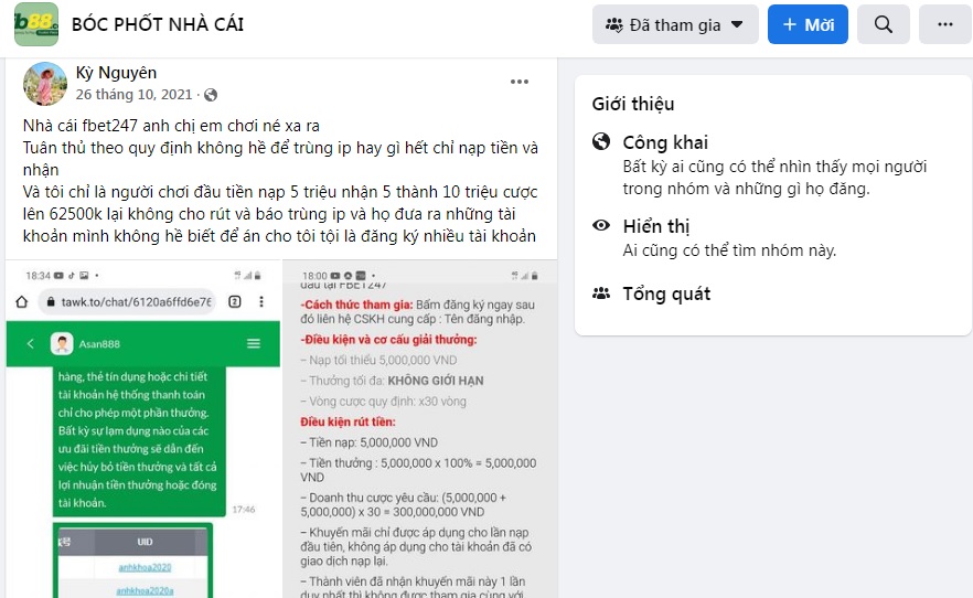 Cụ thể, một thành viên cho biết anh nạp 5 triệu vào FBET247 theo khuyến mãi thưởng 100%. Sau đó anh chơi thắng lên 62.5 triệu đủ điều kiện rút tiền. FBET247 không cho rút mà báo rằng tài khoản game của anh trùng với người khác. Trong khi đây là tài khoản lần đầu anh đăng ký trên FBET247.