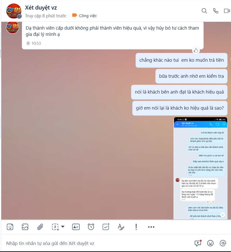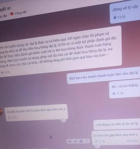 Tin nhắn của đại lý yêu cầu VZ99 thanh toán tiền hoa hồng