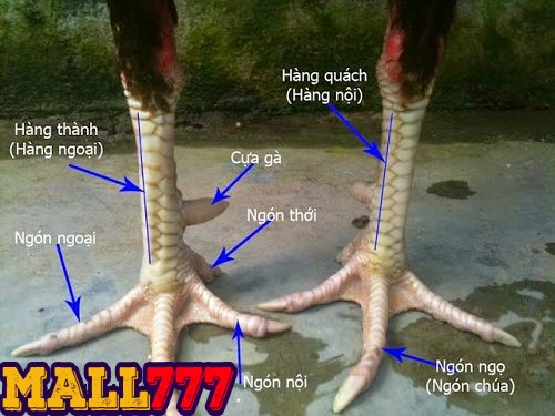 10. Liên Móng : Những vảy trên ngón dính đôi hoặc ba,cho biết cái chân ấy mạnh. Khi đá,gà dùng ngón và móng nhiều ,hiểm lắm, gọi là Liên Móng hay Liên Tự Thừa Thiên,gà có nhiều đòn lạ.