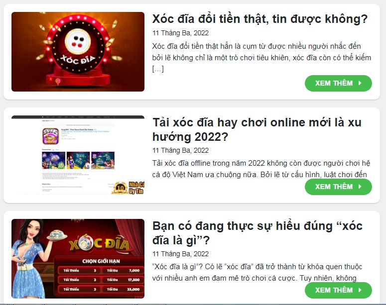 Ví dụ cụ thể về tựa game xóc đĩa, chúng tôi làm rõ những điểm hấp dẫn nhất của game; giải đáp xóc đĩa có lừa đảo hay không, bật mí mẹo chơi xóc đĩa dễ thắng… Thay vì mất thời gian tìm, nghiên cứu trên nhiều blog thì anh em chỉ cần vào Tổng hợp tin tức sẽ có tất cả những thông tin mình cần về tựa game.